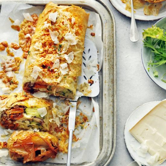Een heerlijke strudel gevuld met courgette, geitenkaas en een sjalotten chutney