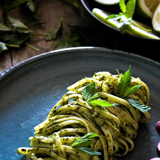 TAGLIATELLA ROOMSAUS MET SPINAZIE, CHAMPIGNONS EN GAMBA'S PIL PIL