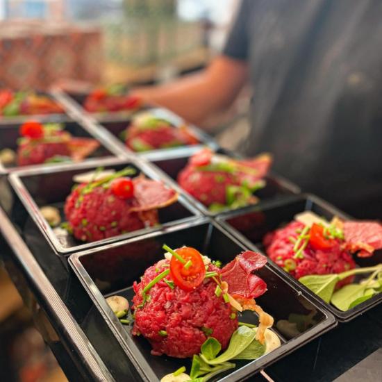 Flinterdun gesneden ossenhaas gevuld met rucola, zontomaat, geroosterde pijnboompitten, parmesan en truffelmayonaise. Om je vingers bij af te likken!!
