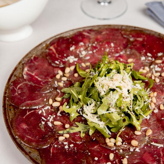 Flinterdun gesneden ossenhaas geserveerd met een romige mosterd-dille dressing, geroosterde pijnboompitten en vers geschaafde Parmezaanse kaas. Een klassieke combinatie van zachte smaken en subtiele frisheid. Let op deze zijn al opgemaakt en klaar om te serveren!