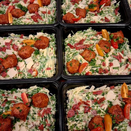 Rucola stamppot met zontomaat en spekjes (huisgemaakt) Een verrassende en ambachtelijk bereide stamppot uit onze eigen keuken. Deze stamppot is gemaakt van zachte aardappelpuree, verfijnd met frisse rucola en zongerijpte tomaatjes. De hartige spekjes zorgen voor een volle en smaakvolle afwerking. Met natuurlijk ons huisgemaakte balletjes gehakt. Een moderne twist op een klassiek gerecht, heerlijk comfortfood voor elk moment. Deze portie is geschikt voor één persoon en heeft een gemiddeld gewicht van circa 400 gram. Dankzij de praktische verpakking is deze stamppot eenvoudig op te warmen in de magnetron, ideaal voor een snelle en smaakvolle maaltijd thuis of op het werk. 🥬🍅🔥