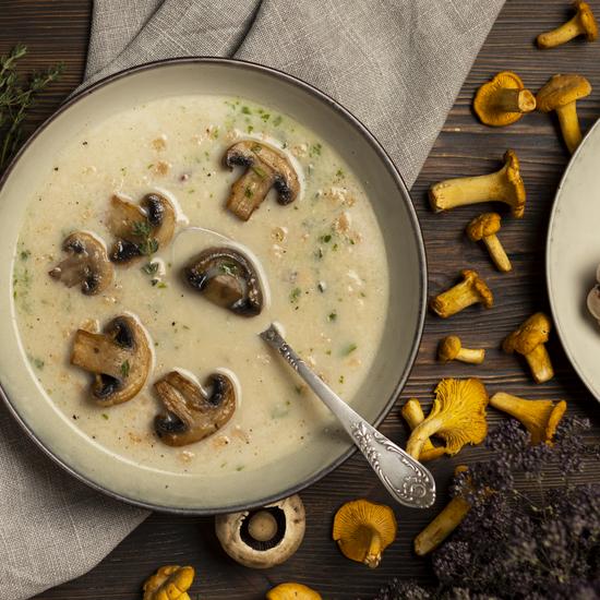 Bospaddenstoelensoep is een smaakvolle soep. Lekker bij de kerst- brunch, lunch, als voorgerecht of volwaardig avondmaal. Je kunt er alle kanten mee op!