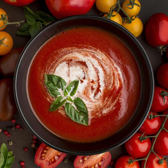 Een heerlijke huisgemaakte tomaten cremé soep van verse tomaten en cremé fraiche.