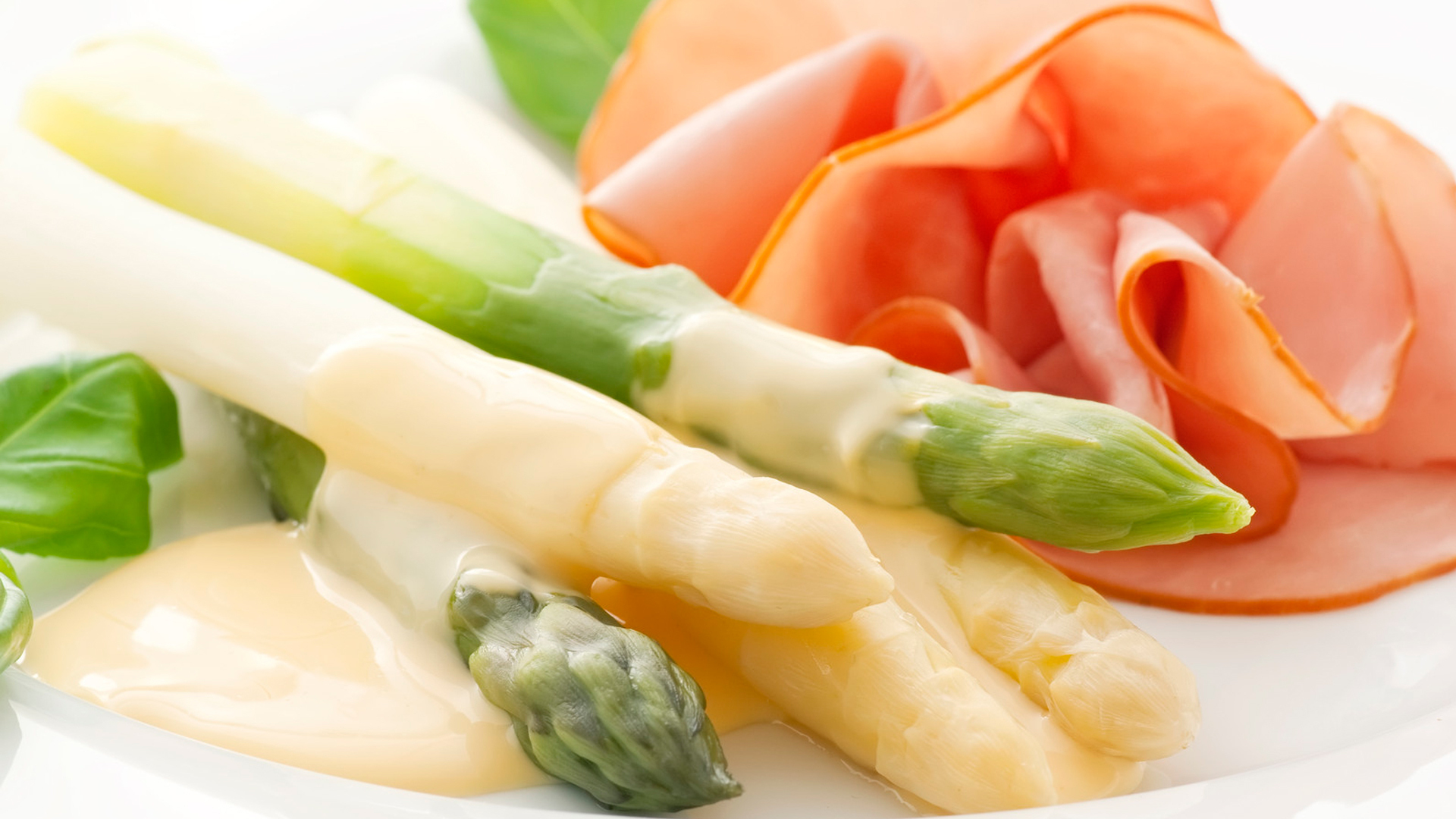 Asperges met gebakken aardappeltjes, zacht ei en ambachtelijke boerenham
